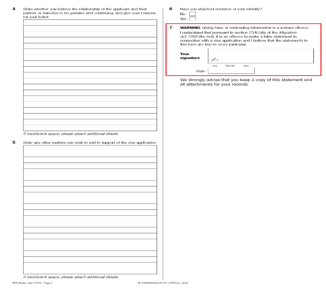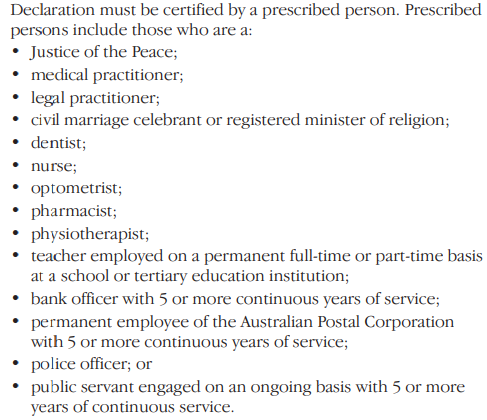 由于此前,888表格是法律聲明statutory declaration,所以除了證明人簽字之外,還要求證明人在有資格的見證人簽字,還要見證人的個人信息。statutory declaration需在符合要求的見證人面前,帶上自己的證件親自簽字才有效,這個步驟就會相當麻煩。如果發現證明人提供虛假或者誤導信息會被判10個月監禁或者12000澳幣罰款。