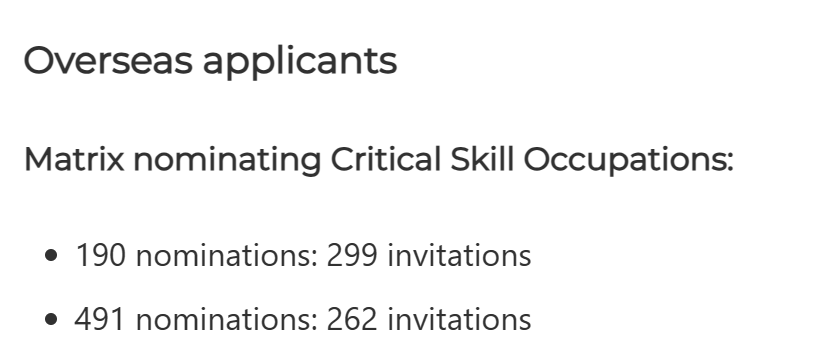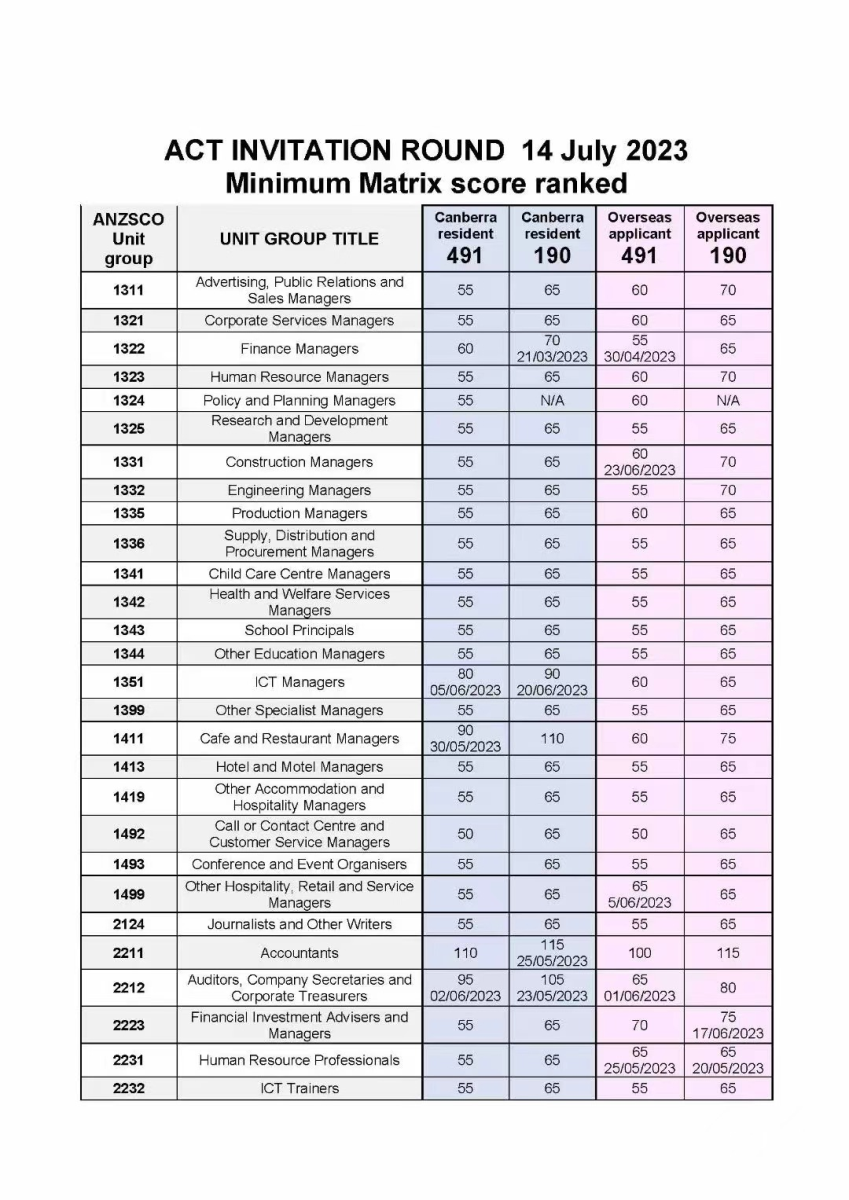 每個職業(yè)中分?jǐn)?shù)排名最高的Matrix將被邀請申請ACT提名。職業(yè)需求量越大,邀請的Matrix分?jǐn)?shù)就越高。EOI都是僅需達到65分,其中491湊到50分,190湊到60分。Matrix目前已經(jīng)沒有達到多少最低分才能獲邀的限制,海外和境內(nèi)申請人是在不同的池子內(nèi),不會放在一起競爭。