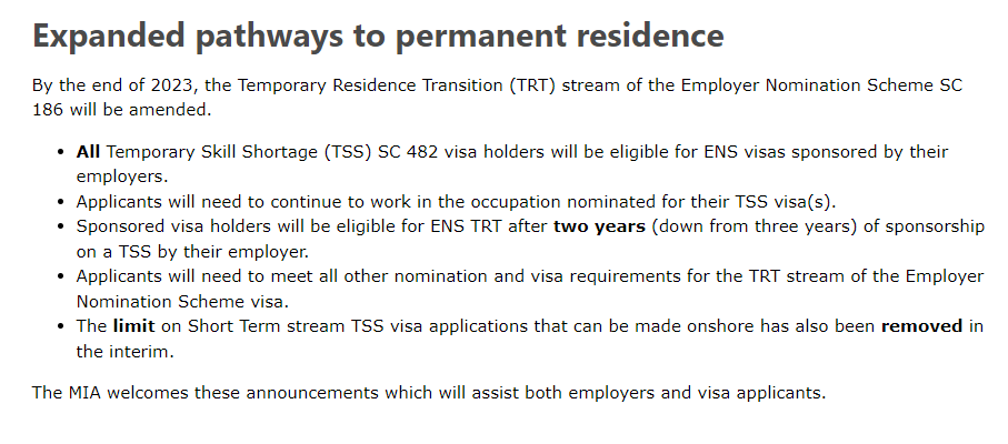 所有臨時技能短缺(TSS)的SC 482簽證持有人將有資格獲得由其雇主贊助的ENS簽證。所有482TSS簽證持有者都可以申請轉(zhuǎn)pr,不限受長期清單限制。