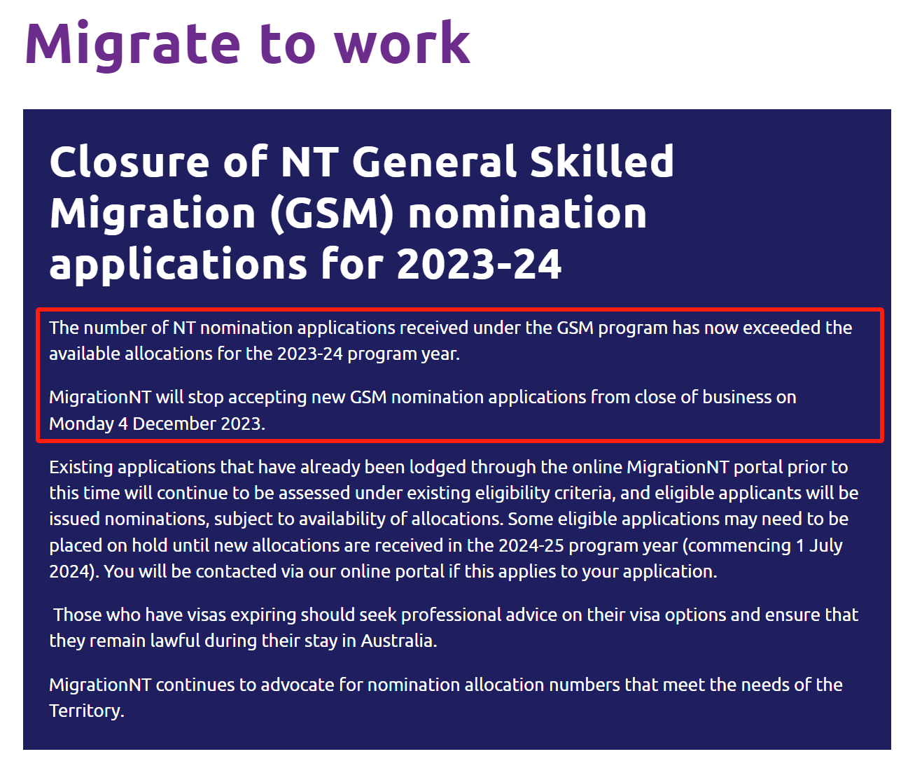 盡管在本財(cái)年伊始時(shí),北領(lǐng)地已經(jīng)宣布暫時(shí)關(guān)閉本財(cái)年的申請(qǐng)通道,并重新開(kāi)放只接受491類別的申請(qǐng)。然而在10月底,北領(lǐng)地宣布重新開(kāi)放491類別的申請(qǐng),但不到兩個(gè)月后,卻又直接宣布關(guān)閉州擔(dān)保通道。