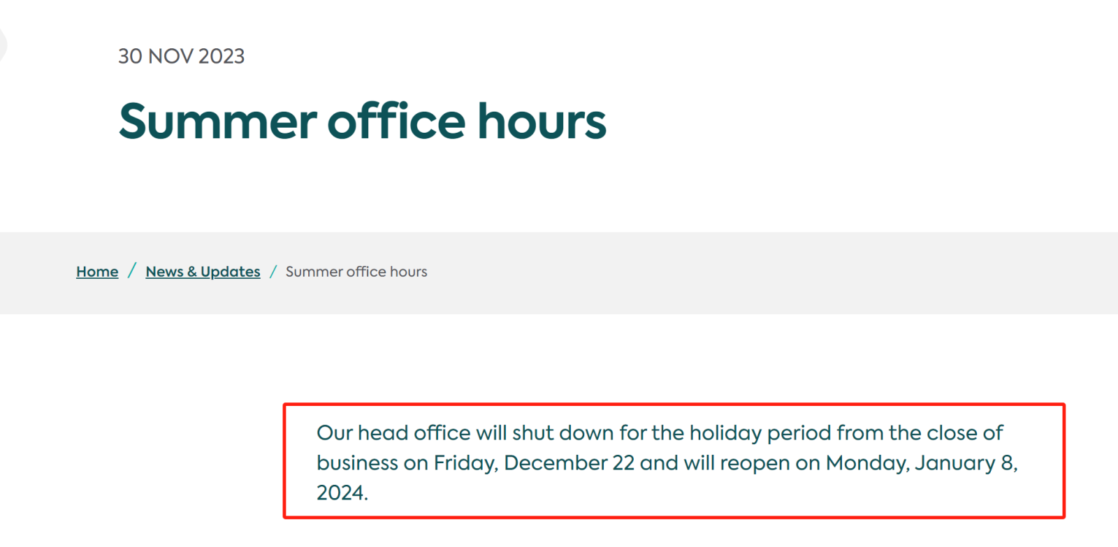 - 辦公室放假通知:VETASSESS總部將于12月22日(星期五)開(kāi)始放假,直至2024年1月8日(星期一)重新開(kāi)放。