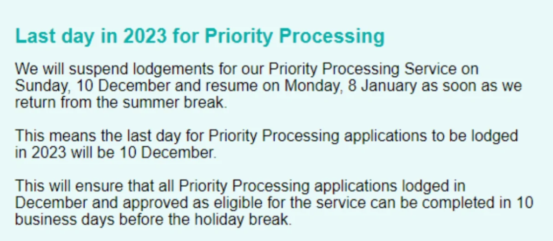 - 加急服務(wù)截止日期時(shí)間:加急服務(wù)的申請(qǐng)將在12月10日(星期日)暫停,并將在2024年1月8日(星期一)假期后立即恢復(fù)。故2023年的最后提交日期為12月10日。這是為了確保12月提交并獲得服務(wù)資格的所有優(yōu)先處理申請(qǐng)可以在假期前的10個(gè)工作日內(nèi)完成。