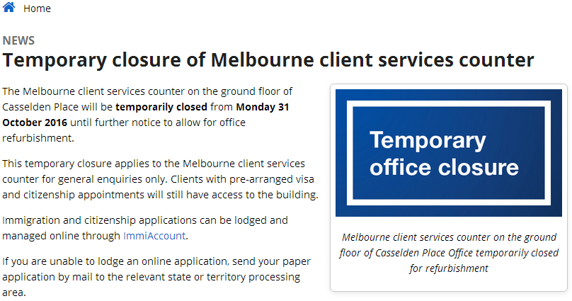 注意:澳洲移民局墨爾本辦公室暫關閉!