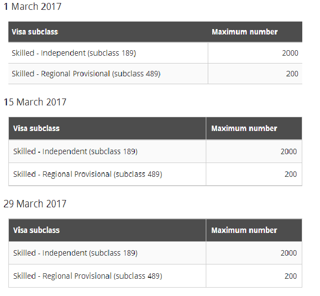 2017年3月份移民局EOI邀請將有3輪,分別在3月1日,3月15日,3月29日,每輪都將發(fā)出2000份189簽證邀請,200份489簽證邀請。