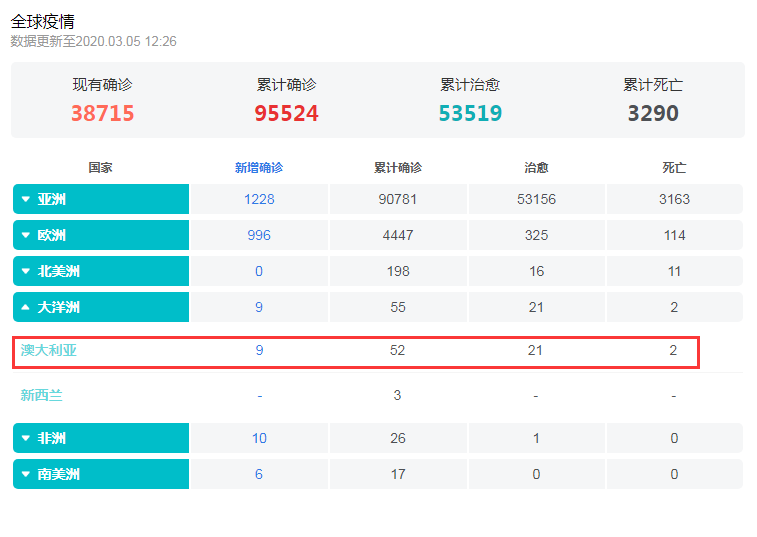 此次新型冠狀病毒疫情突然爆發(fā),并且到現(xiàn)在已經(jīng)持續(xù)一個多月了,中國方面情況在好轉(zhuǎn),但是國外方面有蔓延的趨勢。根據(jù)3月5日更新的數(shù)據(jù),澳大利亞已經(jīng)確診52個病例,維州10例,新州22例,昆州11例,南澳5例,西澳2例,塔州1例,北領(lǐng)地1例。已治愈共21人。