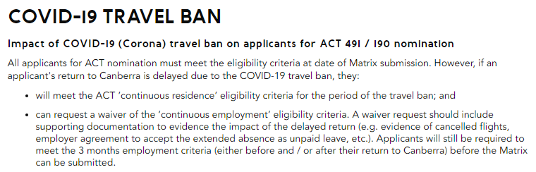 ·針對連續(xù)工作“continuous employment”可以申請豁免,需要提供相關(guān)材料證明延期回澳,包括:被取消的航班、雇主同意延長unpaid leave假期的證明。但是在遞交matrix前仍然要滿足至少工作3個月(不管是回堪培拉前還是回來后)。
