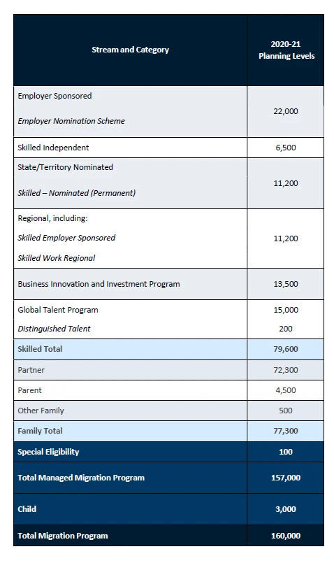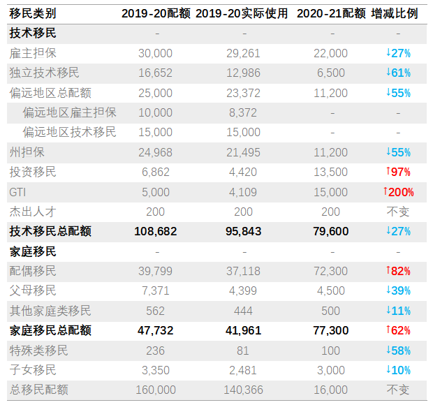 在移民方面,根據新預算案,2020-21財年,澳洲移民的配額依然保持16萬不變。但這16萬的配額在具體分配方面卻有非常大的調整。