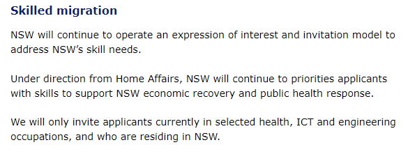 NSW政府今天(10月22日)早上發來最新郵件:確認即將開始發放州擔保邀請!將只會邀請醫療健康,ICT和工程這三大職業的申請人,并且申請人必須要目前居住在新州境內。