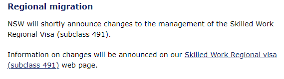 根據州政府的內部會議,新州491會重新將挑選的權力分給偏遠地區政府,意味著各RDA將會有各自的職業清單,但是會由州政府制定統一的申請標準,試運行6個月。目前還沒有出臺細則,預計不久將會公布。