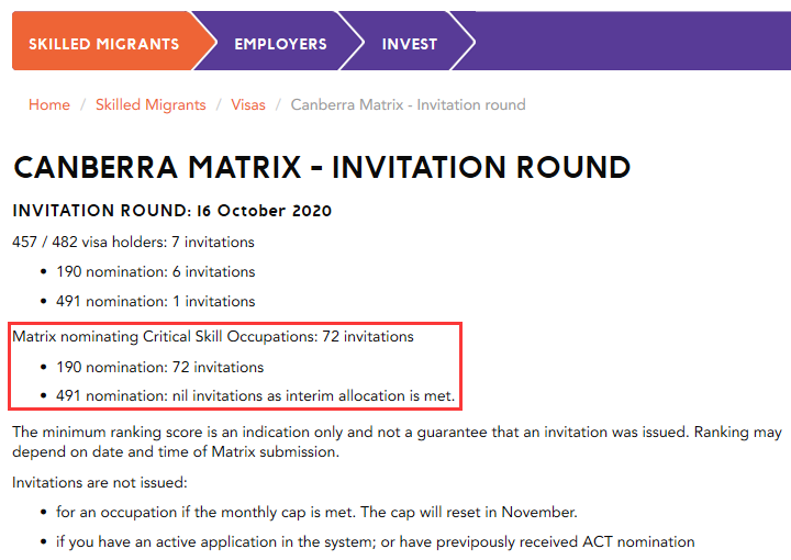 在10月16日最新一輪的Matrix邀請中,針對關鍵職業的申請人發出72個邀請,全部發給190,491邀請0個。因為491的臨時配額已全部用完。IT、土木工程、平面設計的190邀請分數超低,65即可!!估計190的配額也所剩不多了。