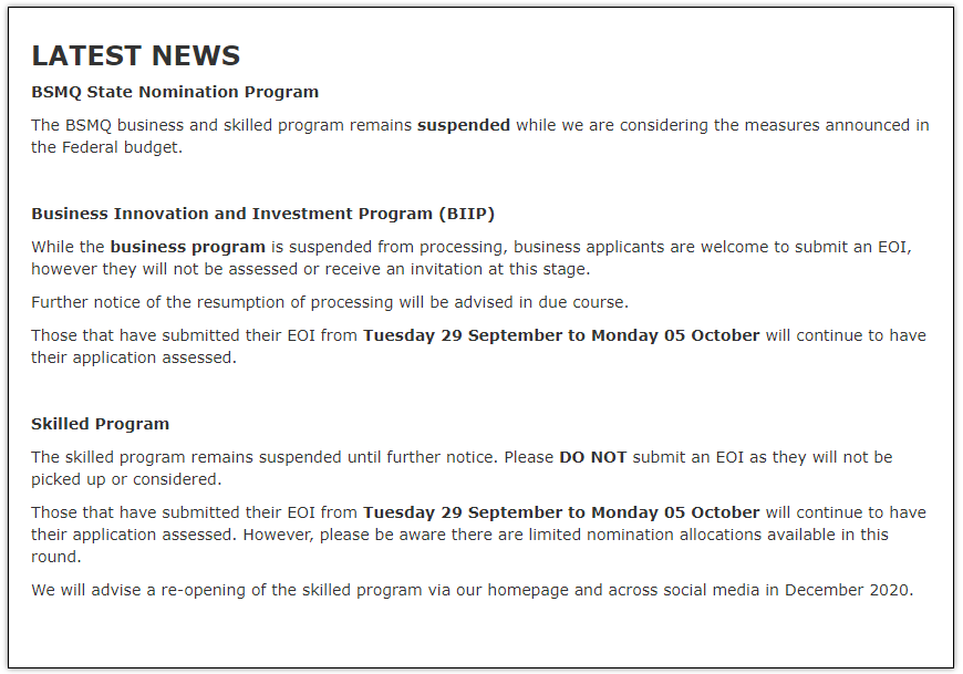 并在9月29日——10月5日短暫開放了一周,技術移民僅接受昆州境內的申請,需要是COVID-19特定緊缺的職業。投資移民境內境外的申請都可以。